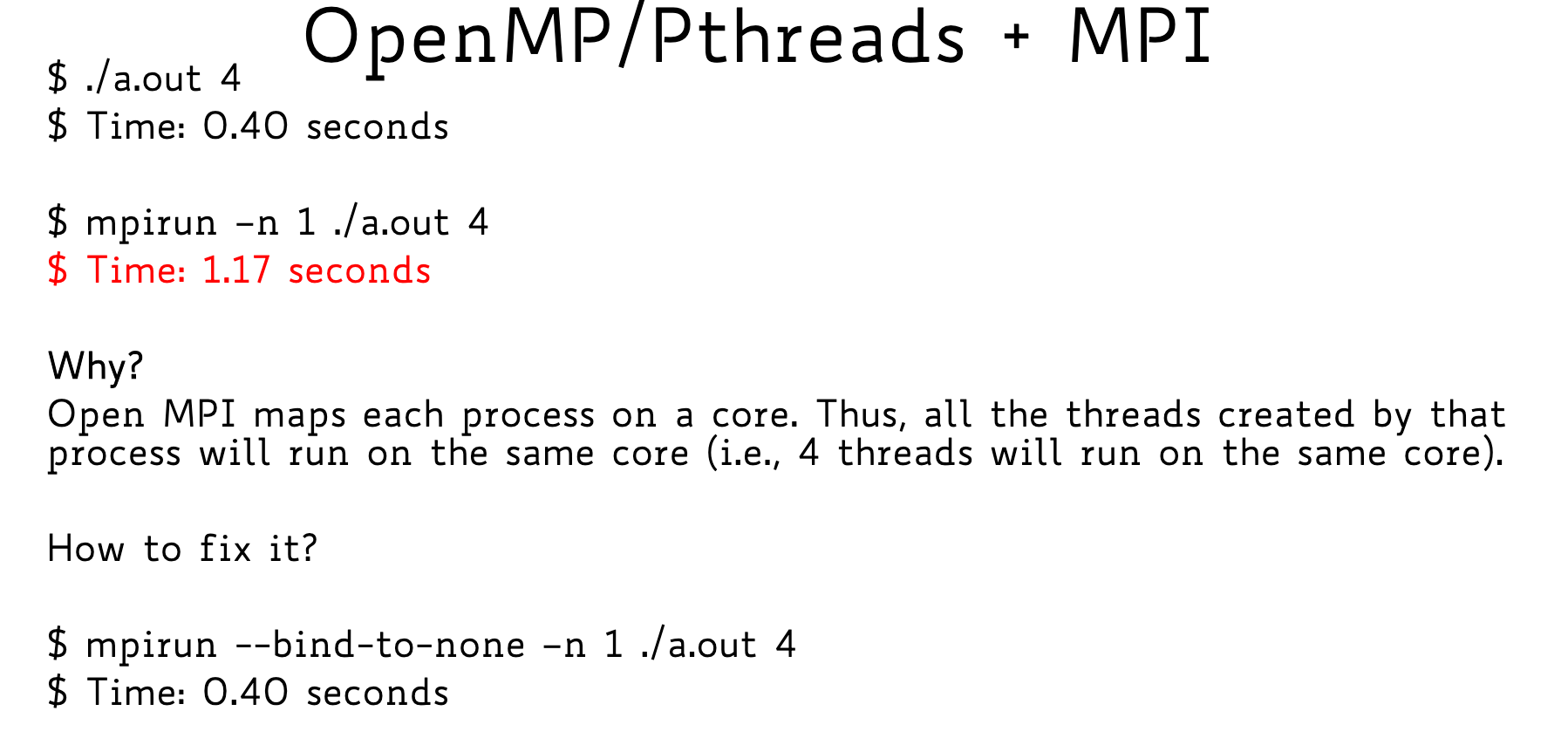 Quando usiamo --bind-to-none permette al thread su core diversi (in momenti diversi), questo potrebbe avere anche dei lati negativi, come la perdita dei dati in cache (la cache è dei singoli core).