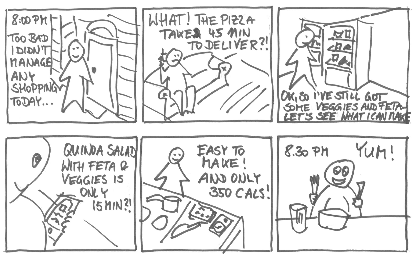 This storyboard illustrates how the app can show the user that a home cooked meal can be quicker than ordering food delivery, using left over ingredients in the fridge:
